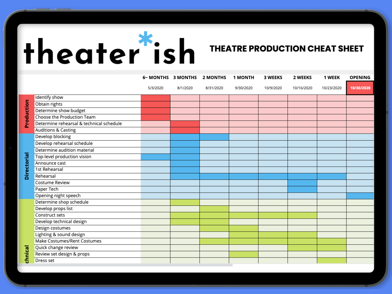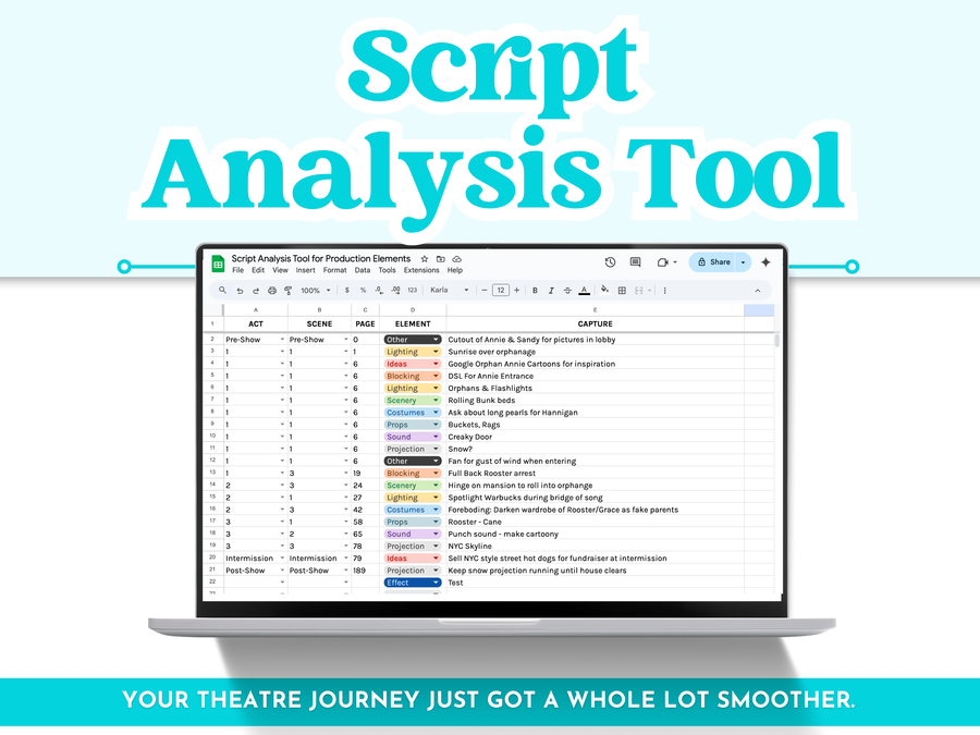 This is the organizational tool I wish I'd had years ago—a comprehensive digital template that helps you track EVERY production element as you work through your script. From blocking and lighting to costumes, props, sound, and projections, nothing falls through the cracks!